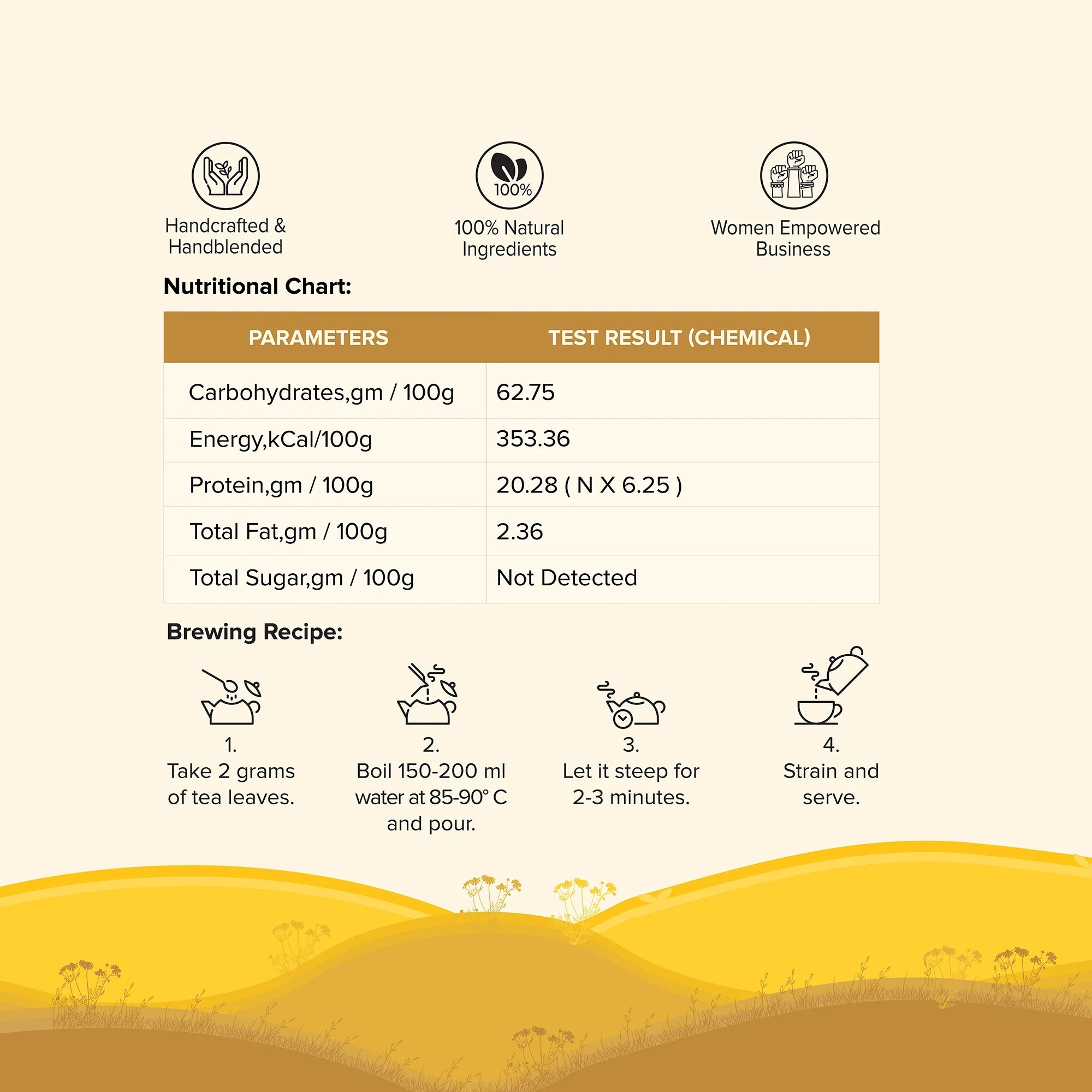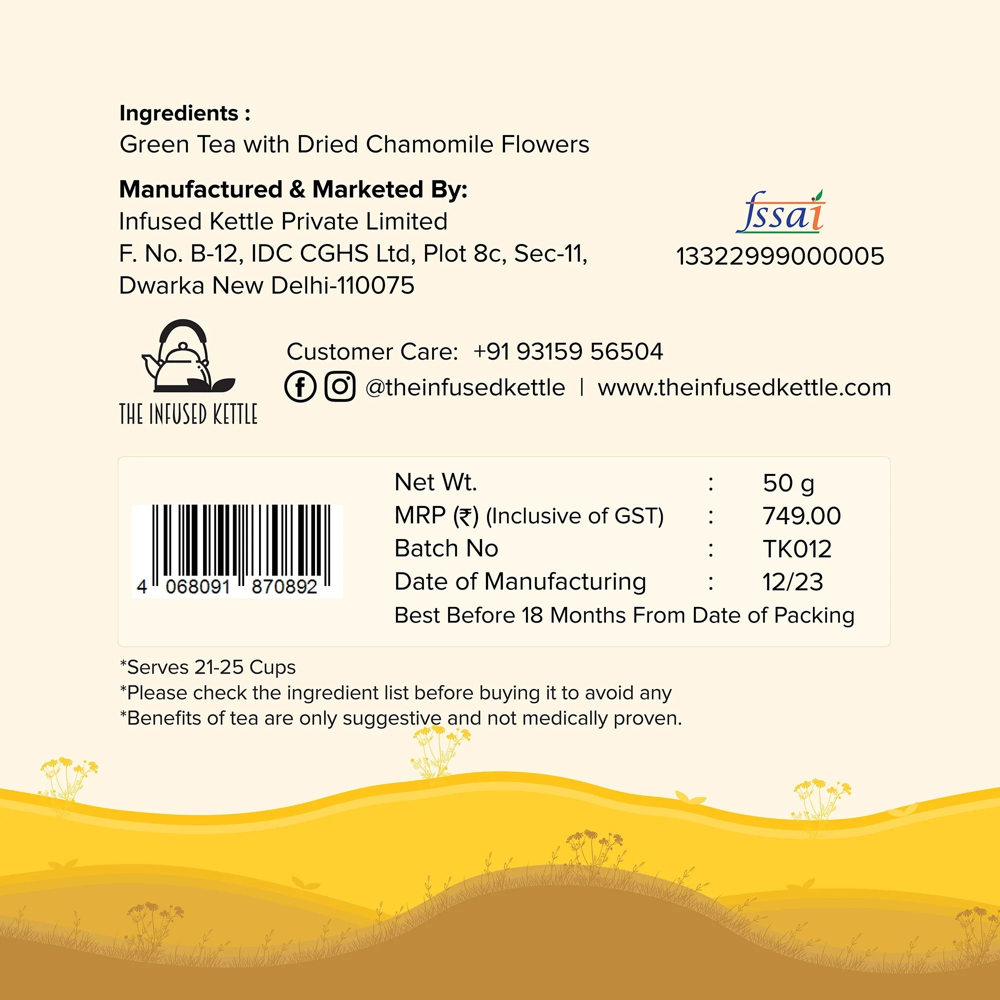 Handcrafted with love, our Chamomile Green Tea combines homegrown chamomile flwowers and green tea from the hills of Darjeeling. Sip serenity and wellness in every cup.
