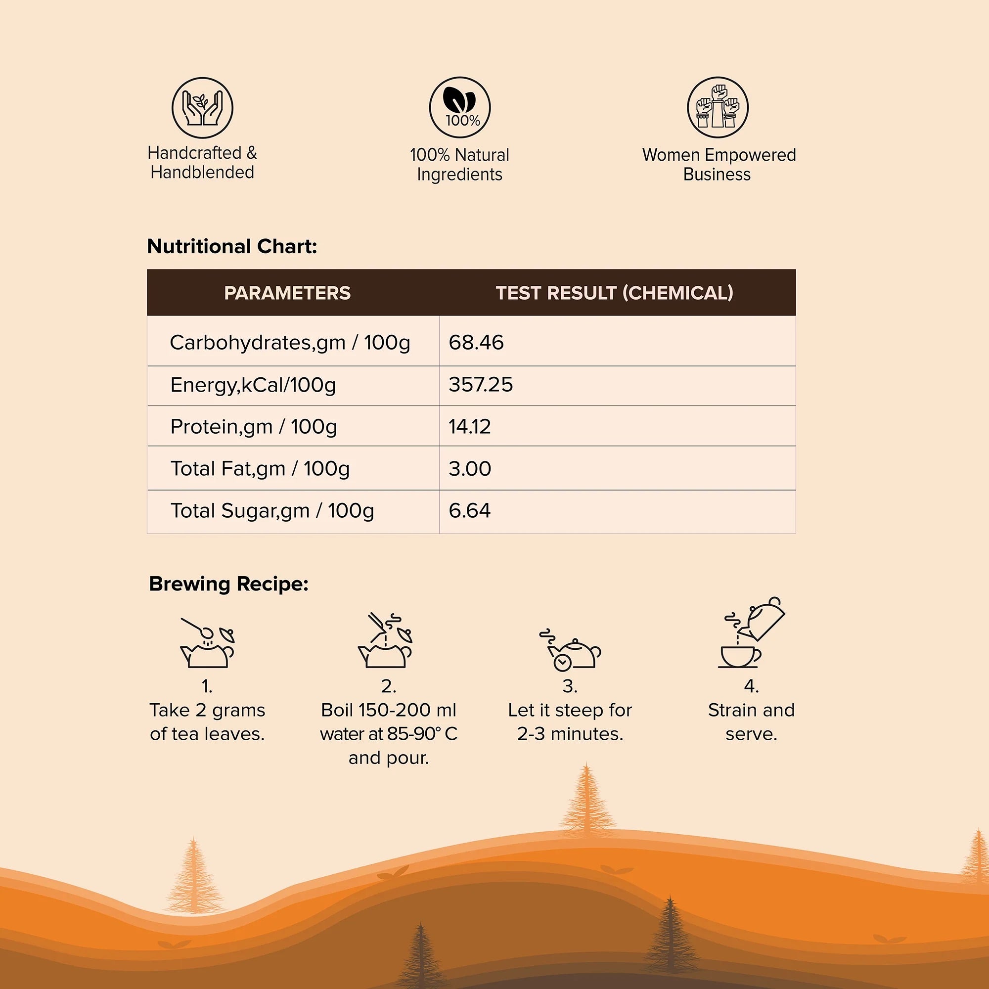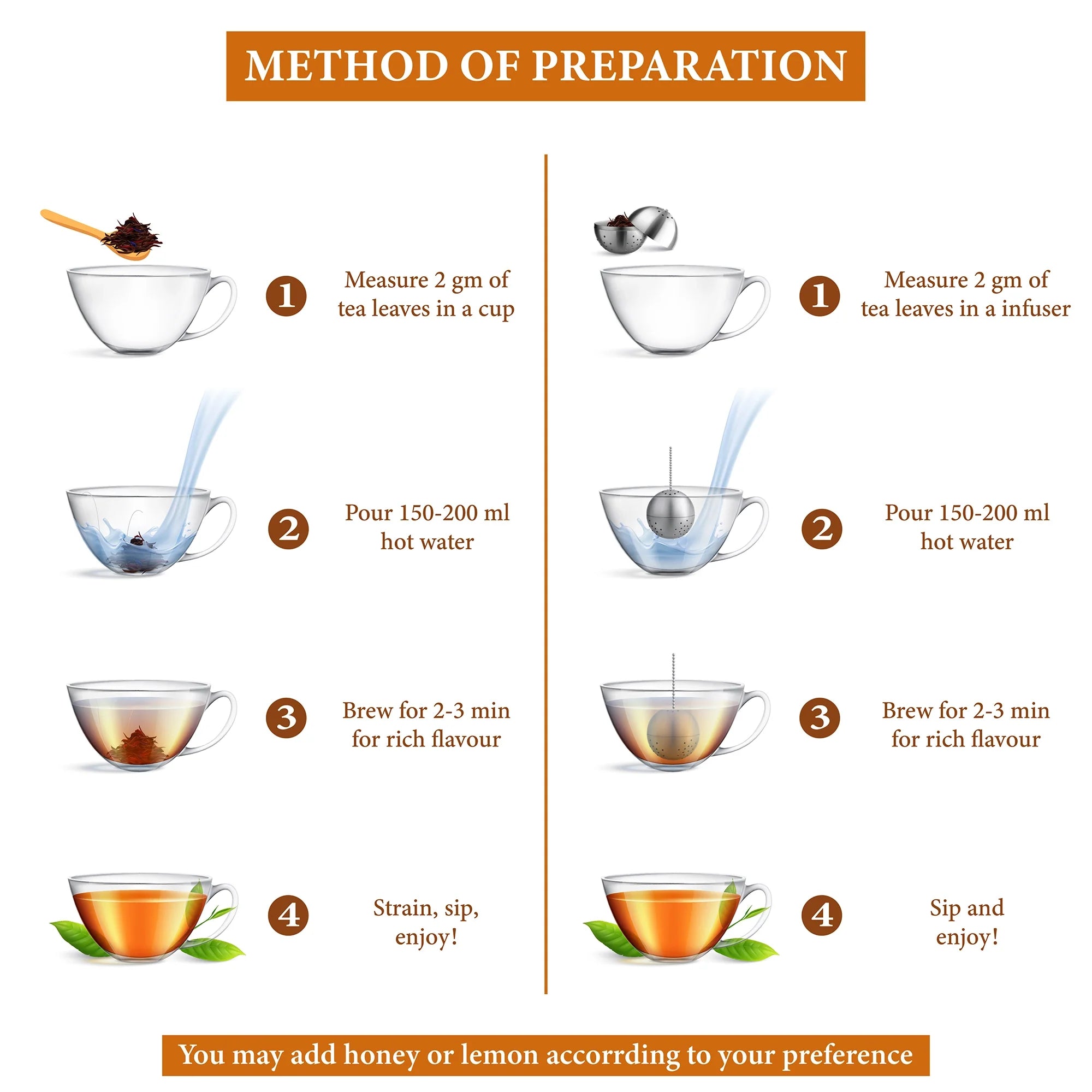 Simply take 2.5 gm of tea leaves, pour 150-200ml hot water, steep for 5 mins, strain, and enjoy.