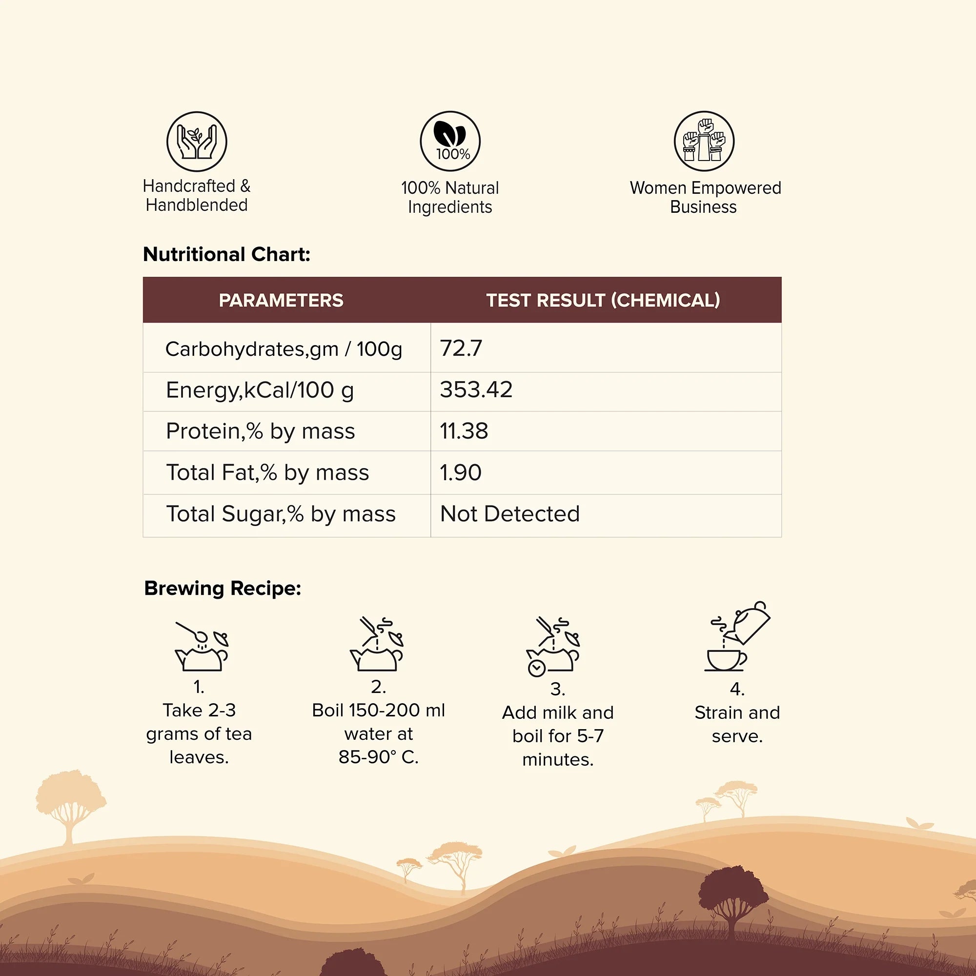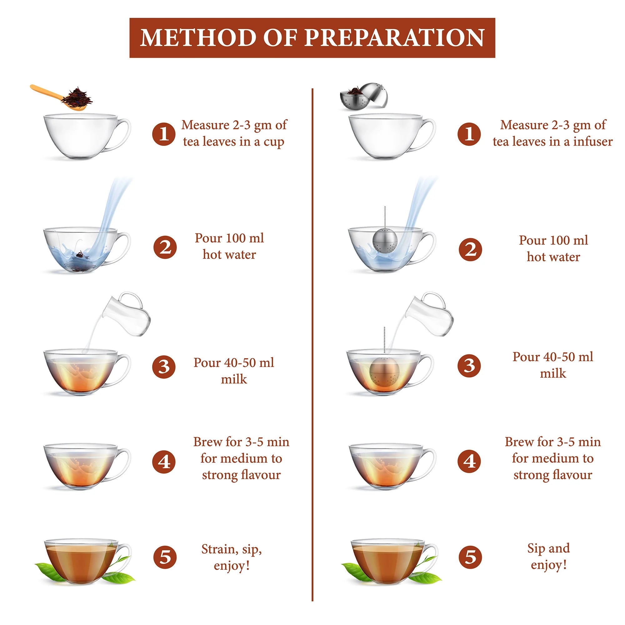 Simply take 2.5 gm of tea leaves, pour 150-200ml hot water, steep for 5 mins, strain, and enjoy the aromatic brew.