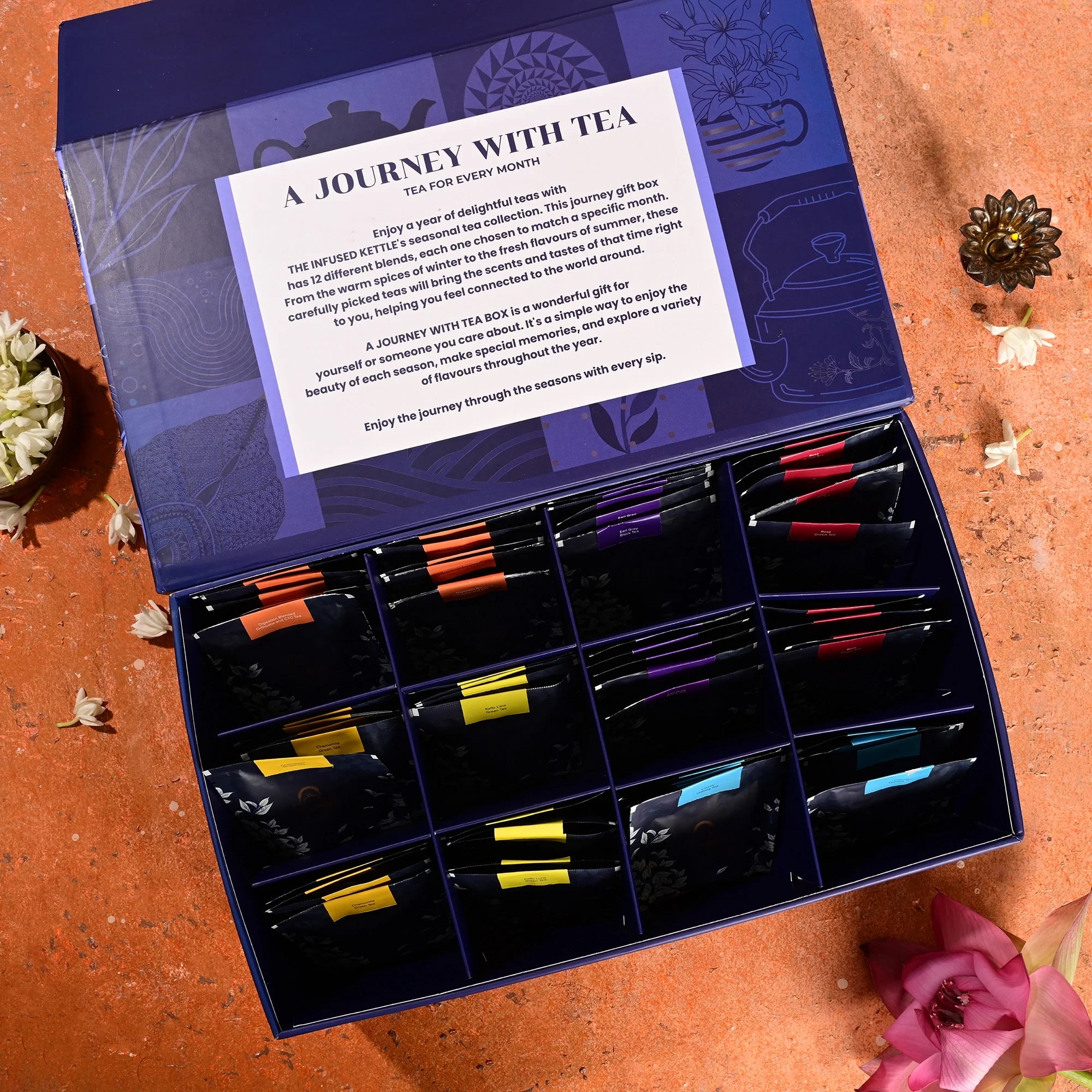 A year of comfort and care, delivered in every cup. The Journey with Tea box is more than just a gift; it's a thoughtful gesture that ensures your loved one never runs out of their favorite brew. Perfect for farewells, this box brings a piece of home to those who are far away, or for new beginnings, like a housewarming or impressing your boss. This gift promises a year-long supply of relaxation and comfort.