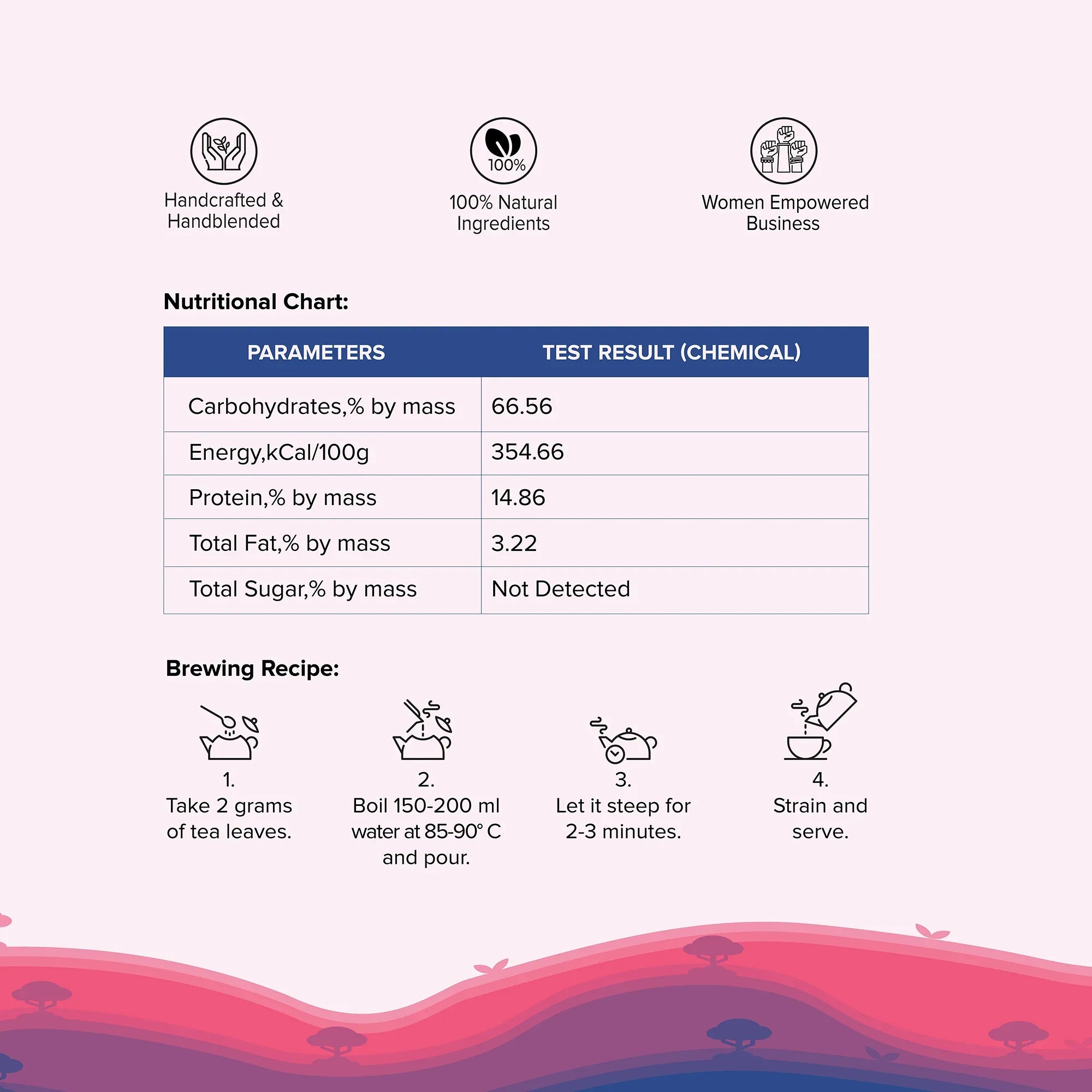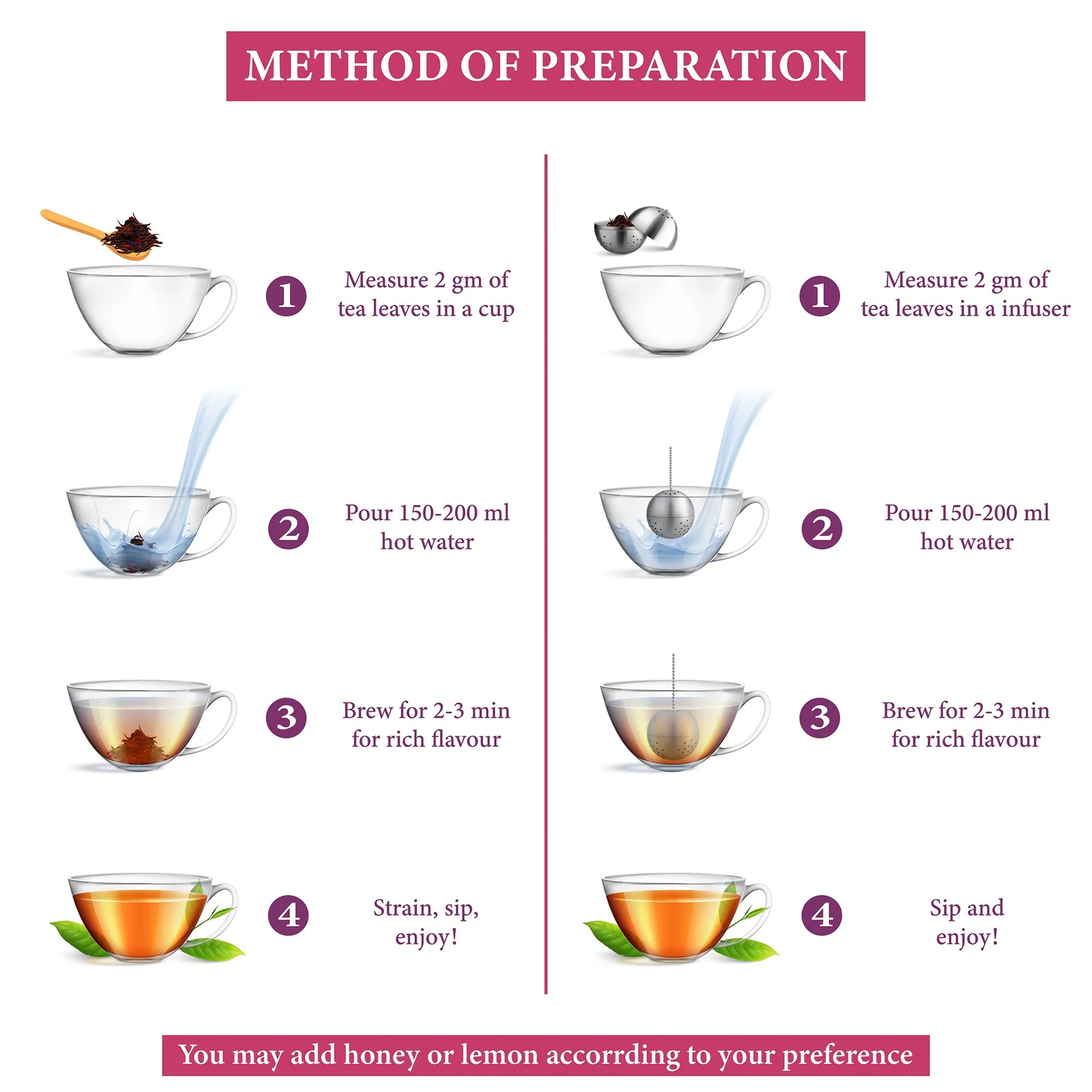 Steep one teaspoon in boiling water for 3-5 minutes. Adjust to taste; longer steeping may intensify flavor and caffeine. Enjoy hot or iced, sweetened with honey if desired.